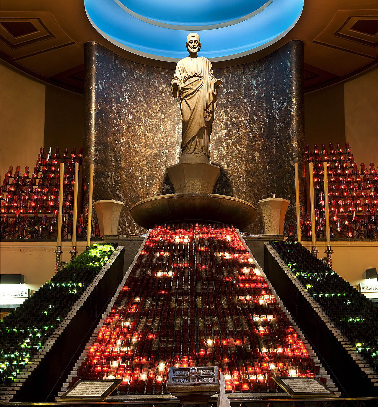 Nhiều nạng gỗ được treo đầy ở tầng dưới của một kiến trúc hai tầng được gọi là Votive Chapel – Nhà Cầu Nguyện với gần 10,000 ngọn nến – trong đó có tượng T. Giuse thật lớn đứng ở phía trước và bên trên ngôi mộ của T. André Bessette ở ngay đằng sau.