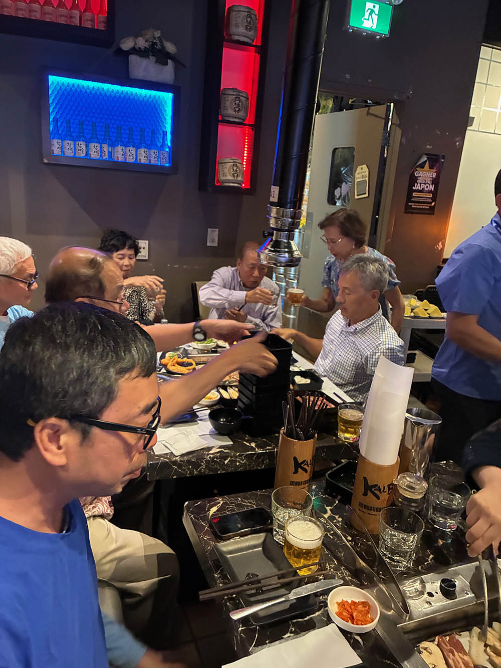 Chúng tôi rời nhà thờ để lái về Montréal sau hơn ba giờ đồng hồ. Cũng nhờ công lao tìm kiếm của chị Tuyết, phái đoàn ăn tối ở nhà hàng Kalbi, trong phố Tầu, chuyên về đồ nướng và sushi, thật ngon. Cũng trong bữa tối này, chúng tôi mừng 56 năm kết hôn của anh chị Luận & Thảo, và cũng mừng sinh nhật của anh Trung. Vui thật vui.